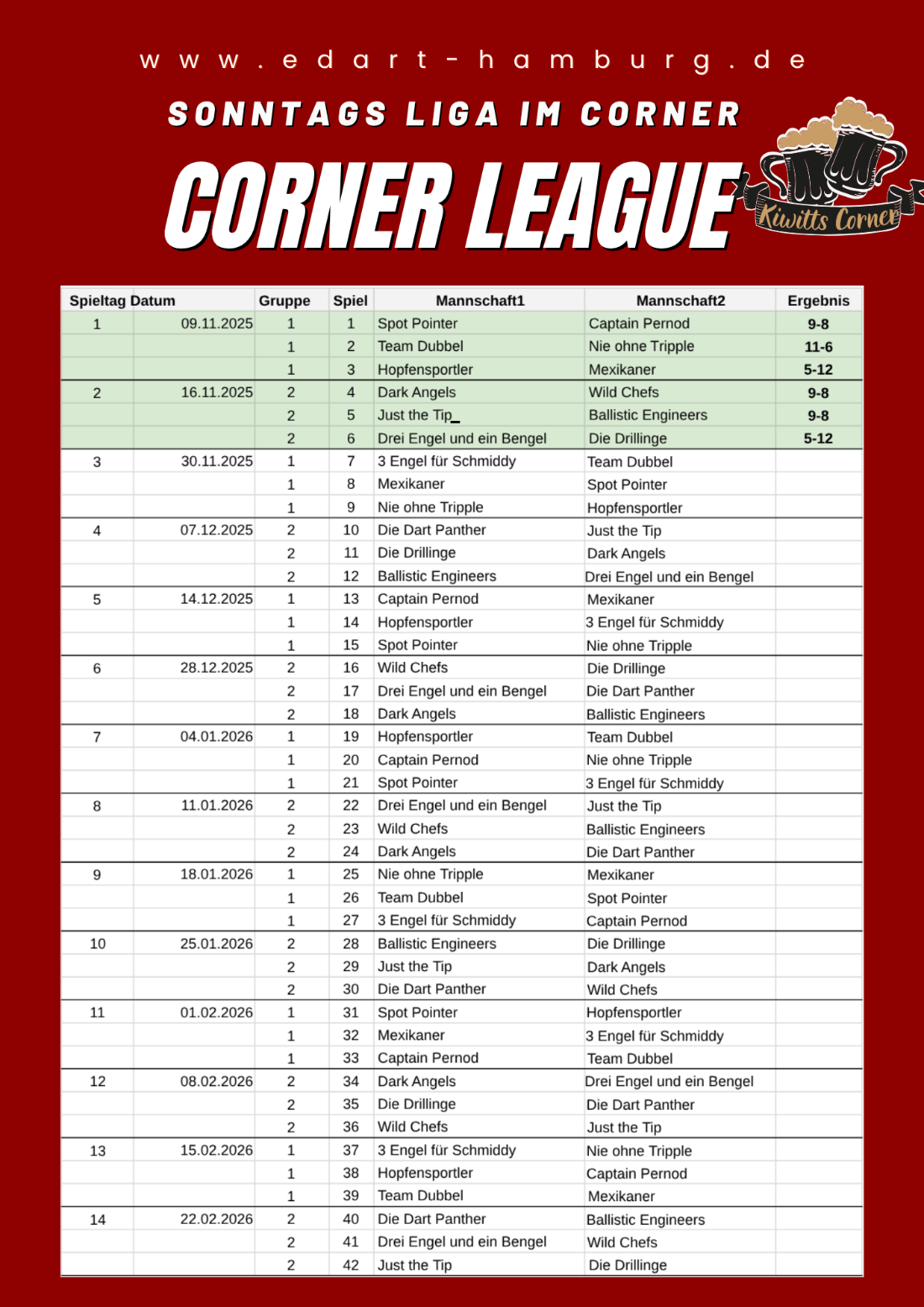 Spielstart ist am Spieltag 16:00Uhr