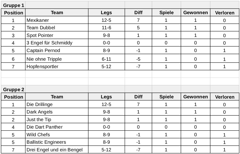 Gespielt wird 501, Open Board, Double Out, 4 Einzel je drei Legs, jedes Leg zählt, ein Doppel, über fünf Legs. Zwei Spieler müssen, sechs Spieler können an einem Spieltag teilnehmen. Spielreihenfolge: Einzel, Einzel, Doppel, Einzel, Einzel.